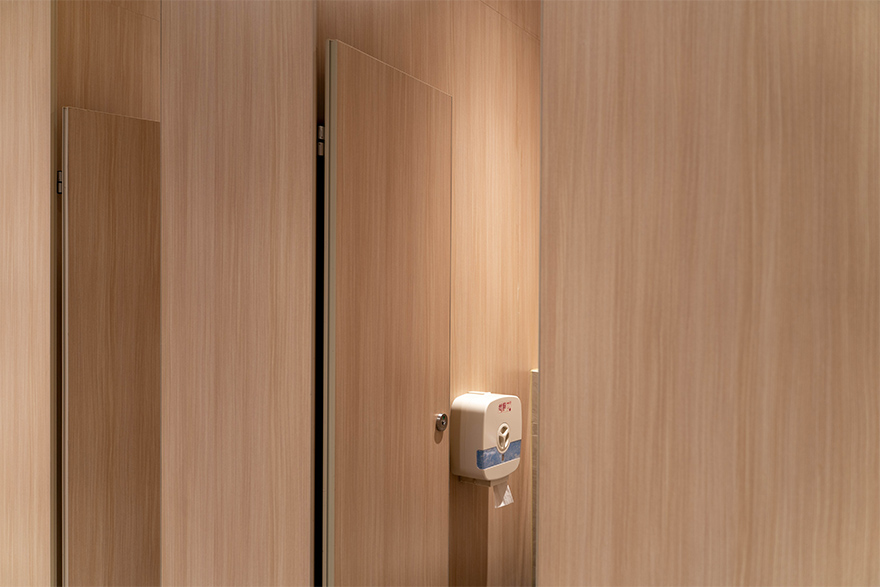 La parete divisoria per WC in laminato compatto BODA è realizzata con film di copertura, carta decorativa melamminica e carta kraft in resina fenolica.